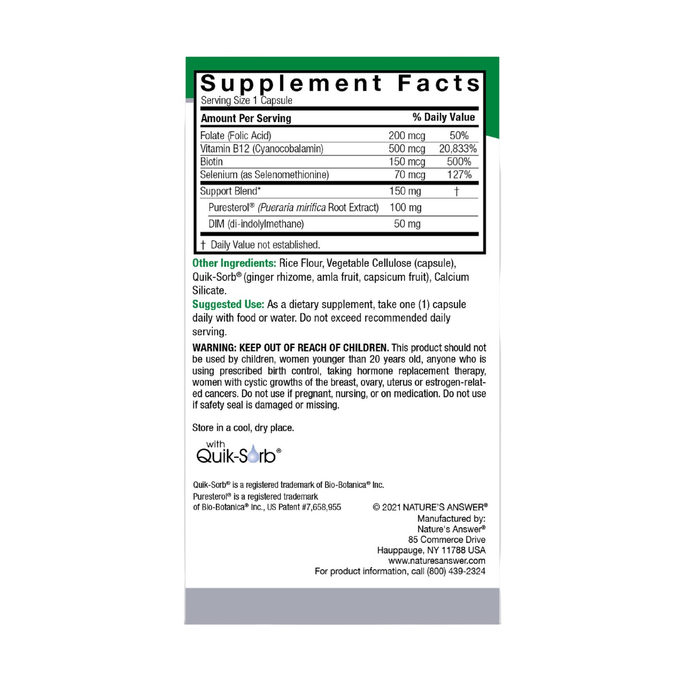 And Nature’s Answer Pueraria Mirifica’s is optimized with QUIK-SORB®. QUIK-SORB® is an exclusive blend of important herbs known to enhance the delivery of nutrients to the body. So you can be sure that everything, from Nature’s Pueraria Mirifica plant to the active phytoestrogens, Biotin, Selenium, and all the other ingredients are working as hard as they can to give your body what it needs. All with the convenience of a single vegetarian capsule just one time a day.